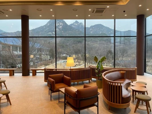 최근 가장 인기 있는 경치 원픽 스타벅스라 불릴 만큼 압도적입니다. 실내에서도 북한산 능선을 통으로 감상할 수 있고 테라스 좌석의 몰입감이 특히 뛰어납니다.