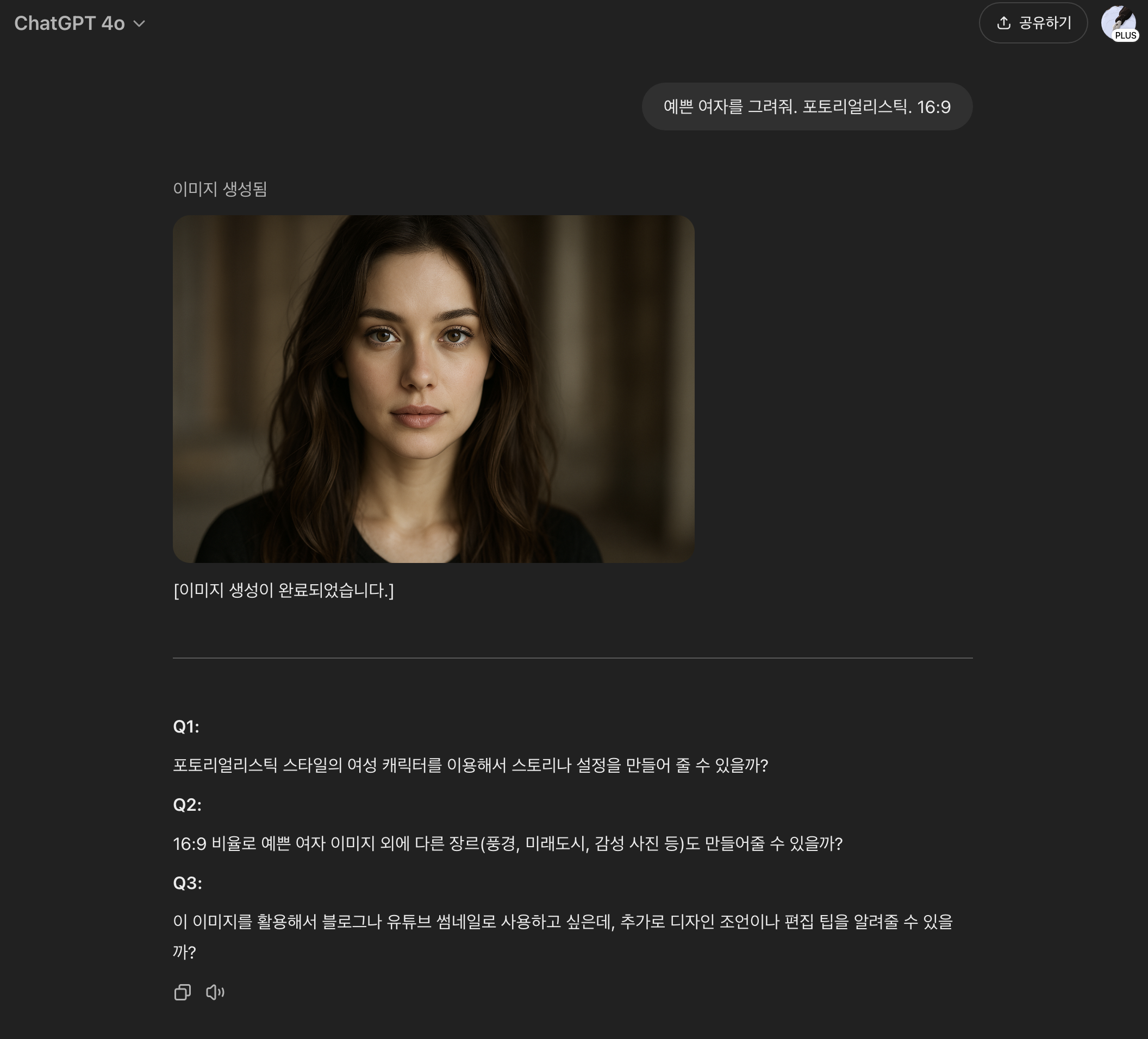 GPT가 샘프롤 만들어준 여자의 사진을 다시 채팅창에 드래그앤 드랍으로 집어넣습니다. 그리고 GPT에게 명령어를 함께 입력하면 끝납니다. 그리고 잠시 기다리면 아래와 같이 최종 이미지가 완성됩니다.