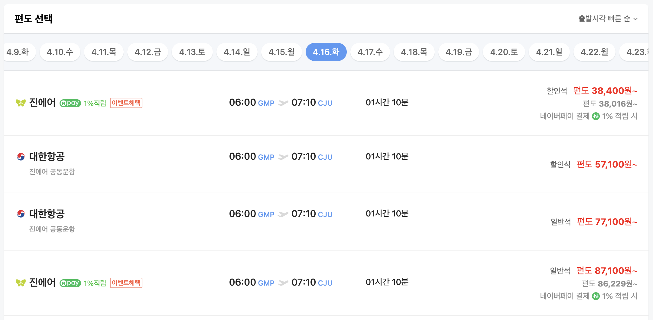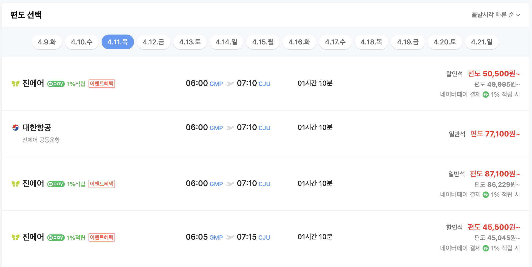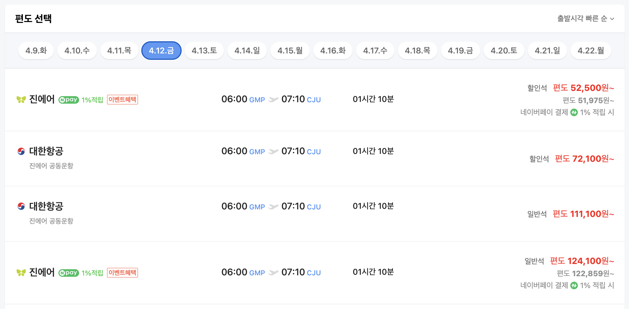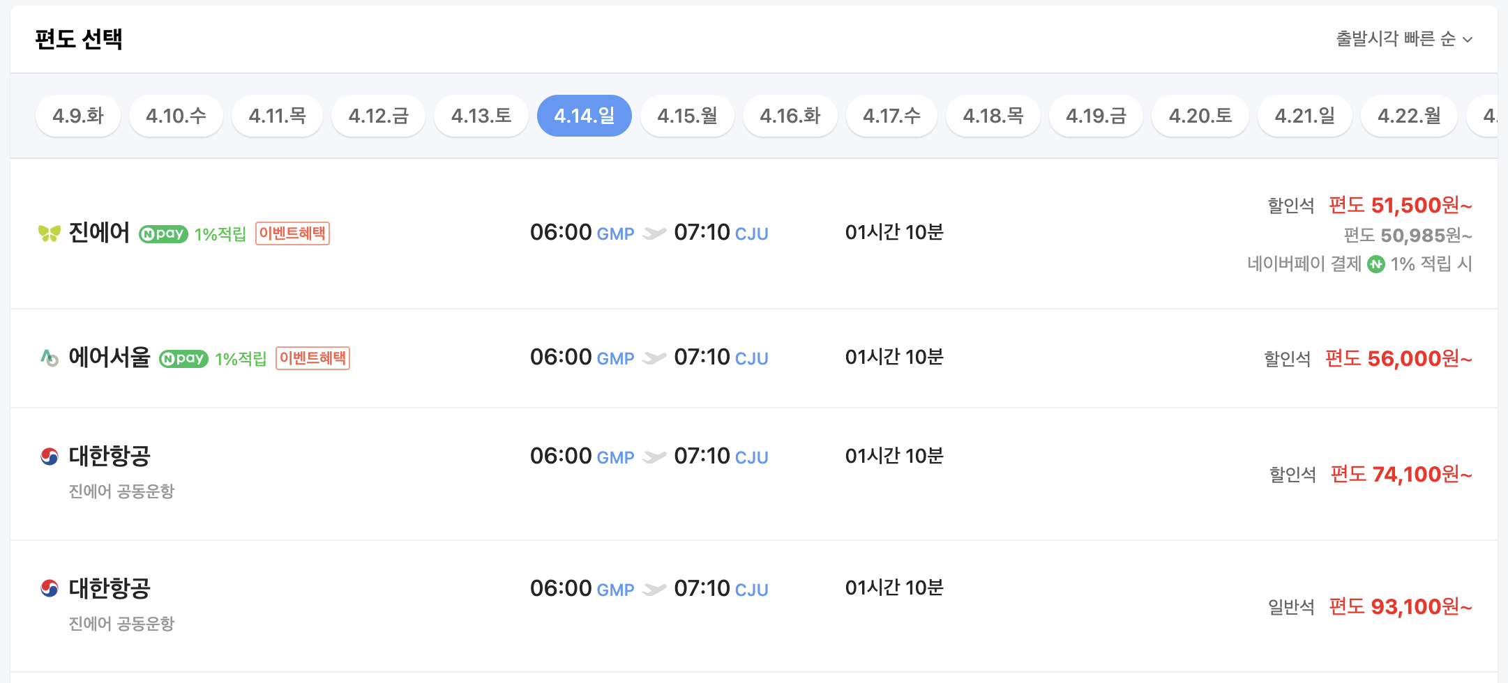 - 김포 출발 제주공항 도착으로 편도 요금 조회