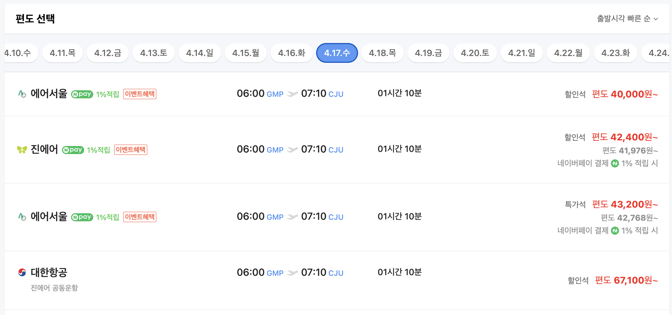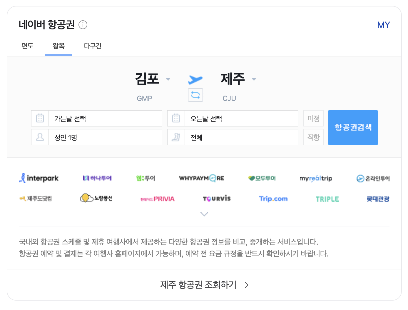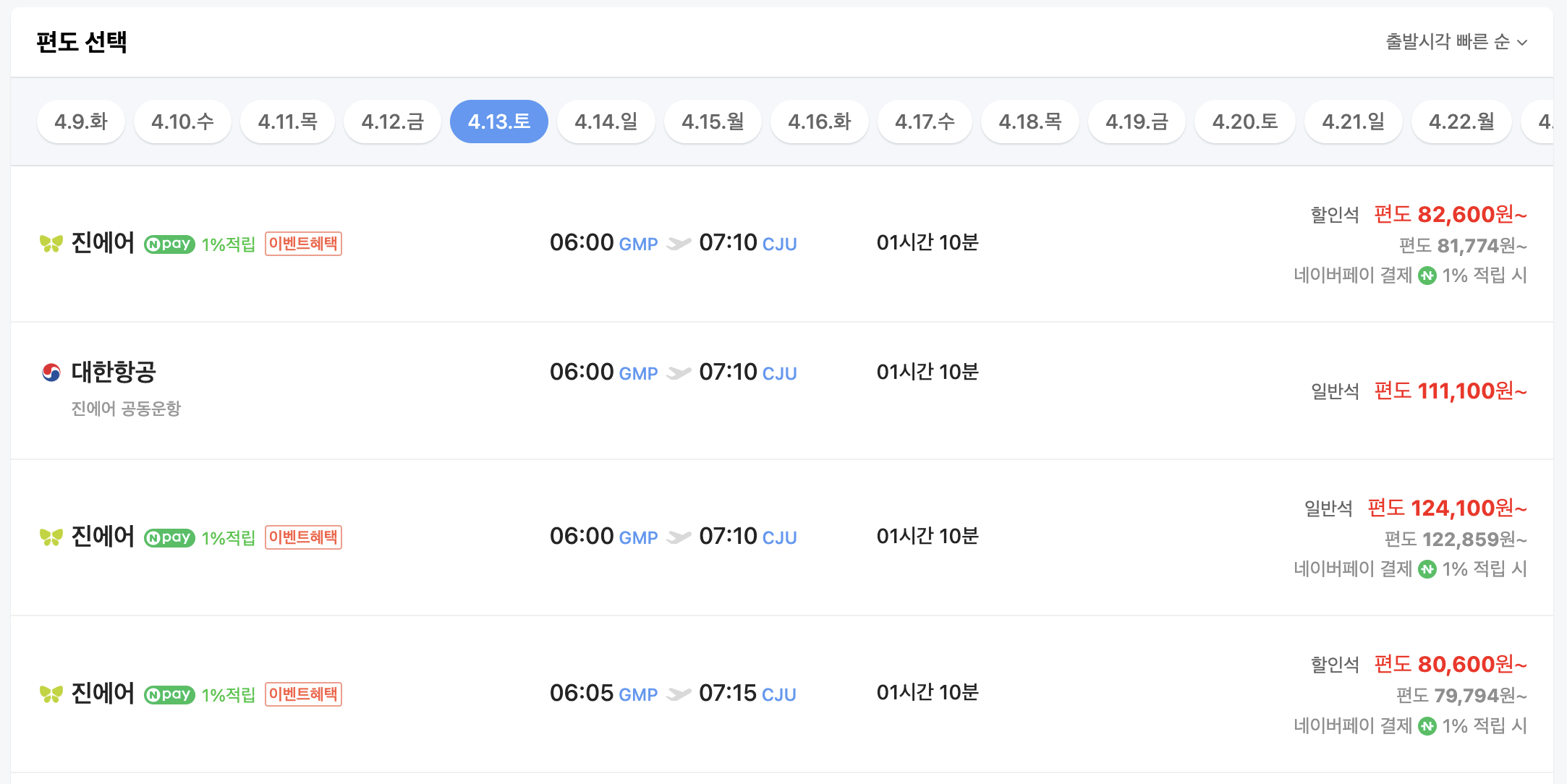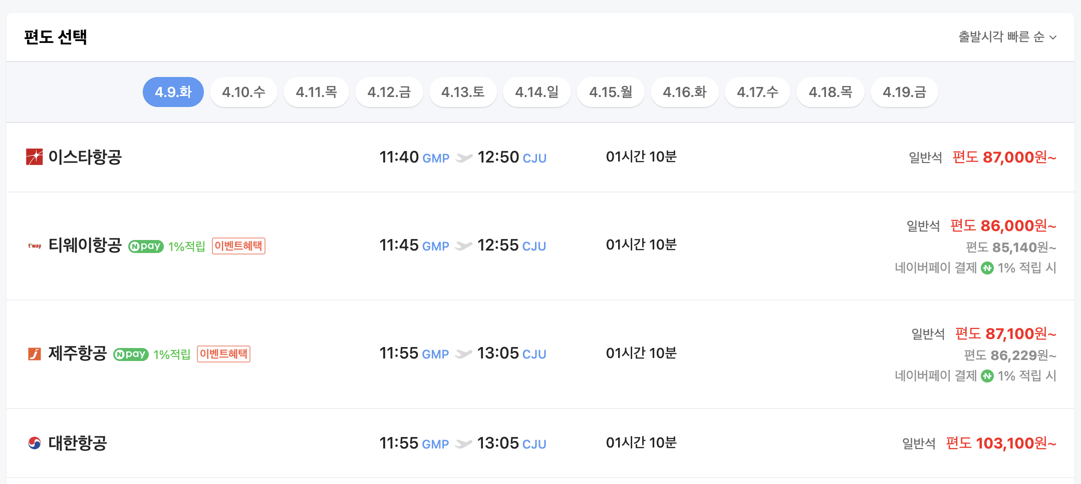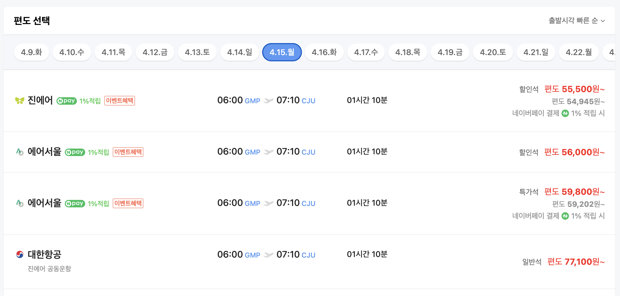 - 김포 출발 제주공항 도착으로 편도 요금 조회