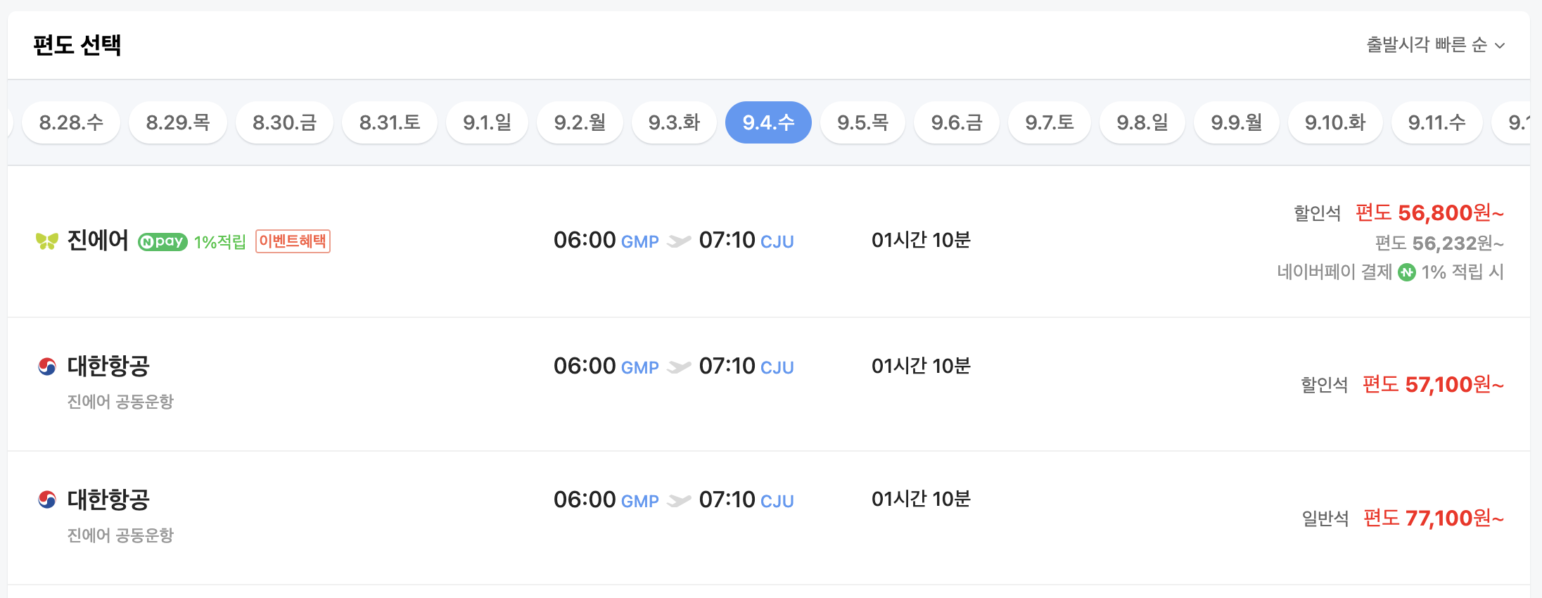 1주일 간의 첫출발 비행기 요금을 기준으로 조회해본 결과, 사람이 많이 몰리지 않는 요일인 화요일이 제주도 항공권 가격이 저렴했습니다. 물론 항공권의 가격은 사전에 미리 예약할수록 저렴하다고 하지만, 항공권 편도 요금은 대체로 평균 5~8만 원대에 형성되어 있었습니다. 물로 이것은 아침 가장 빠른 출발을 기준으로 한 것입니다.