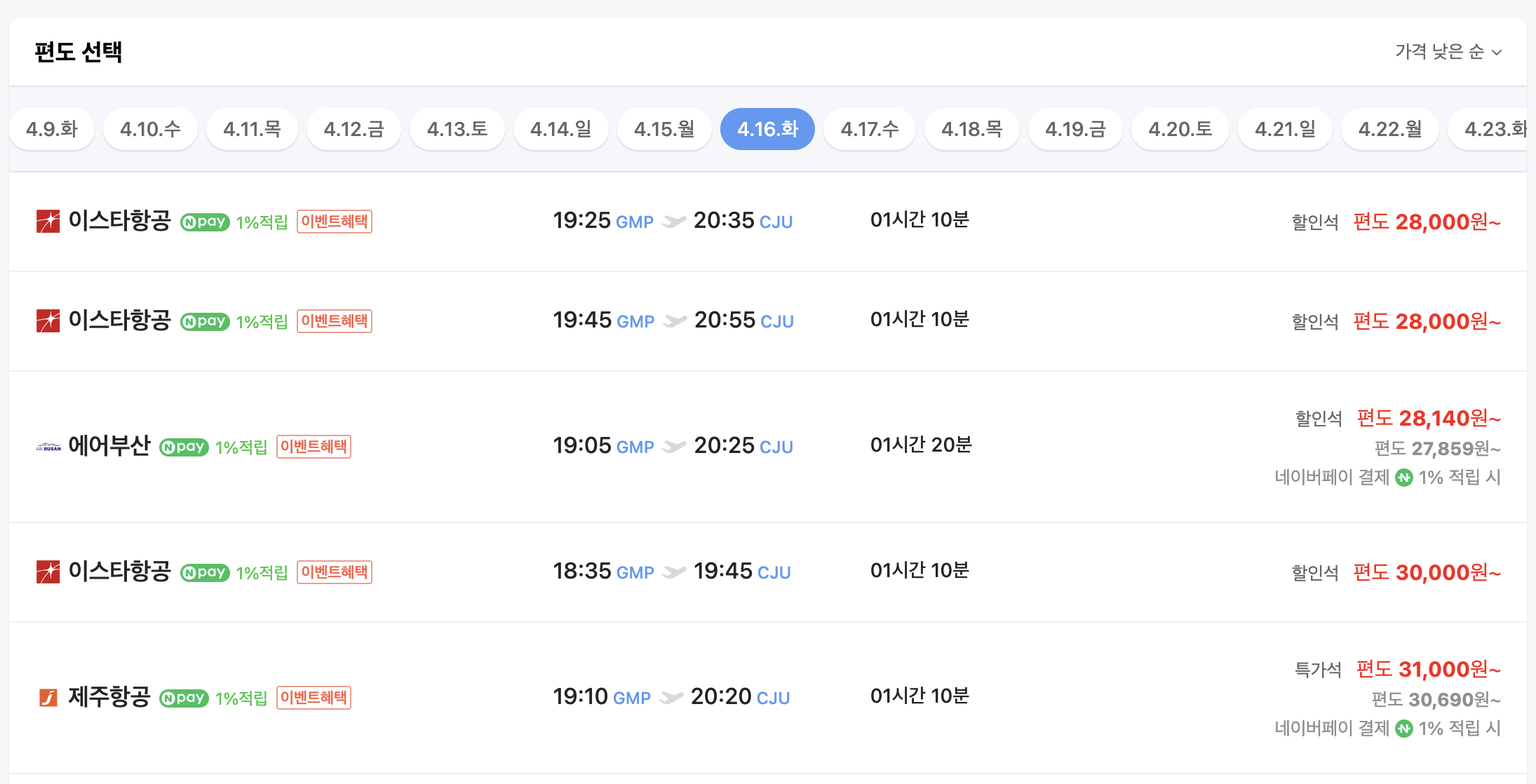 제주도 항공권 비행기 값 이 가장 저렴한 요일